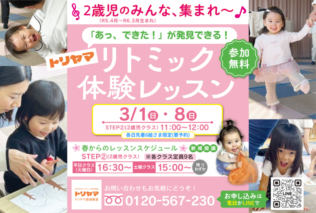 無料体験レッスン 2026.02.20 1歳児・2歳児クラス春のリトミック無料体験レッスン開催! お申し込みは、 「春の無料体験レッスン公式LINE」で ↓ https://lin.ee/SCxmSa2 みなさまのご参加お待ちしております!